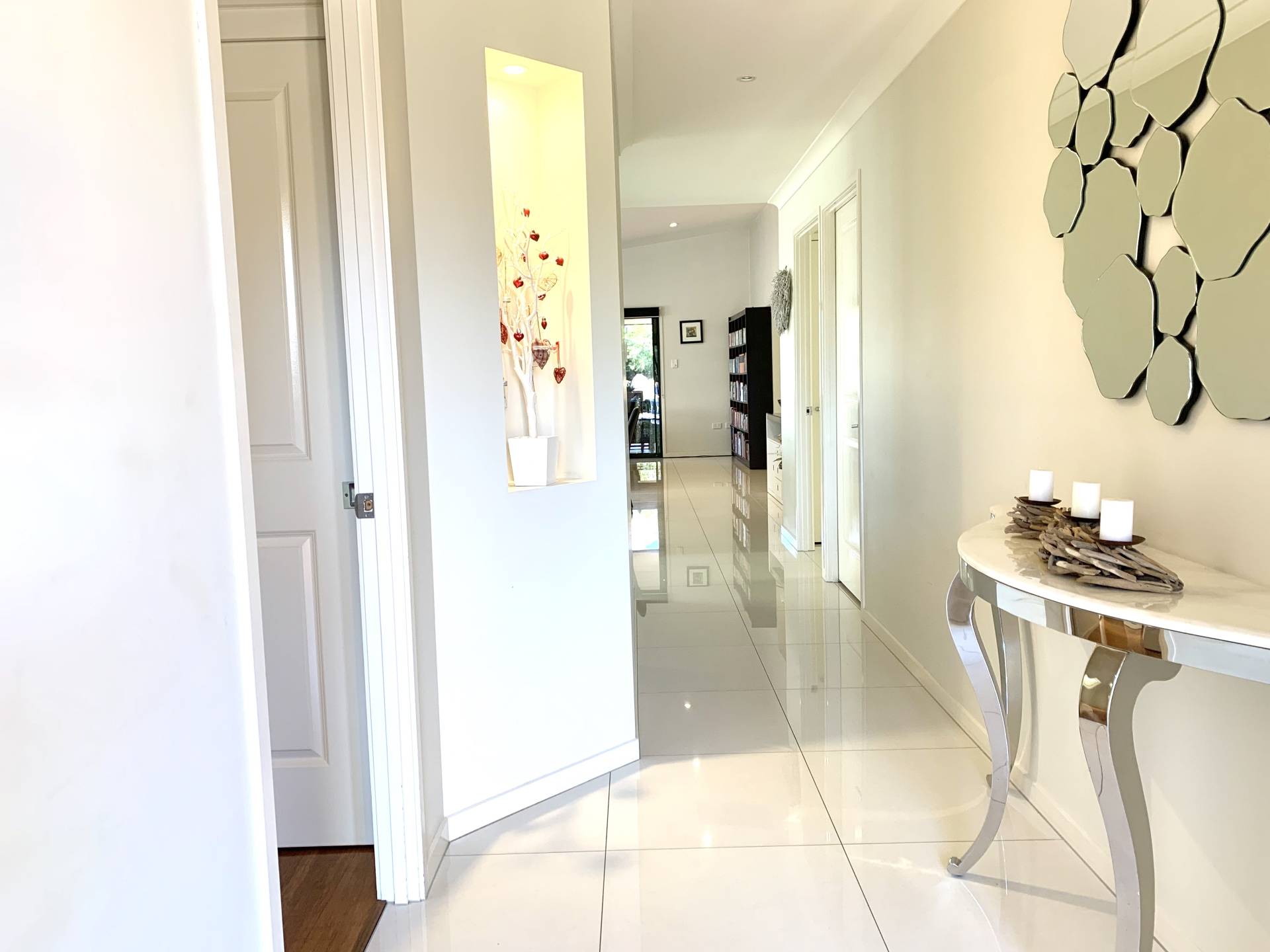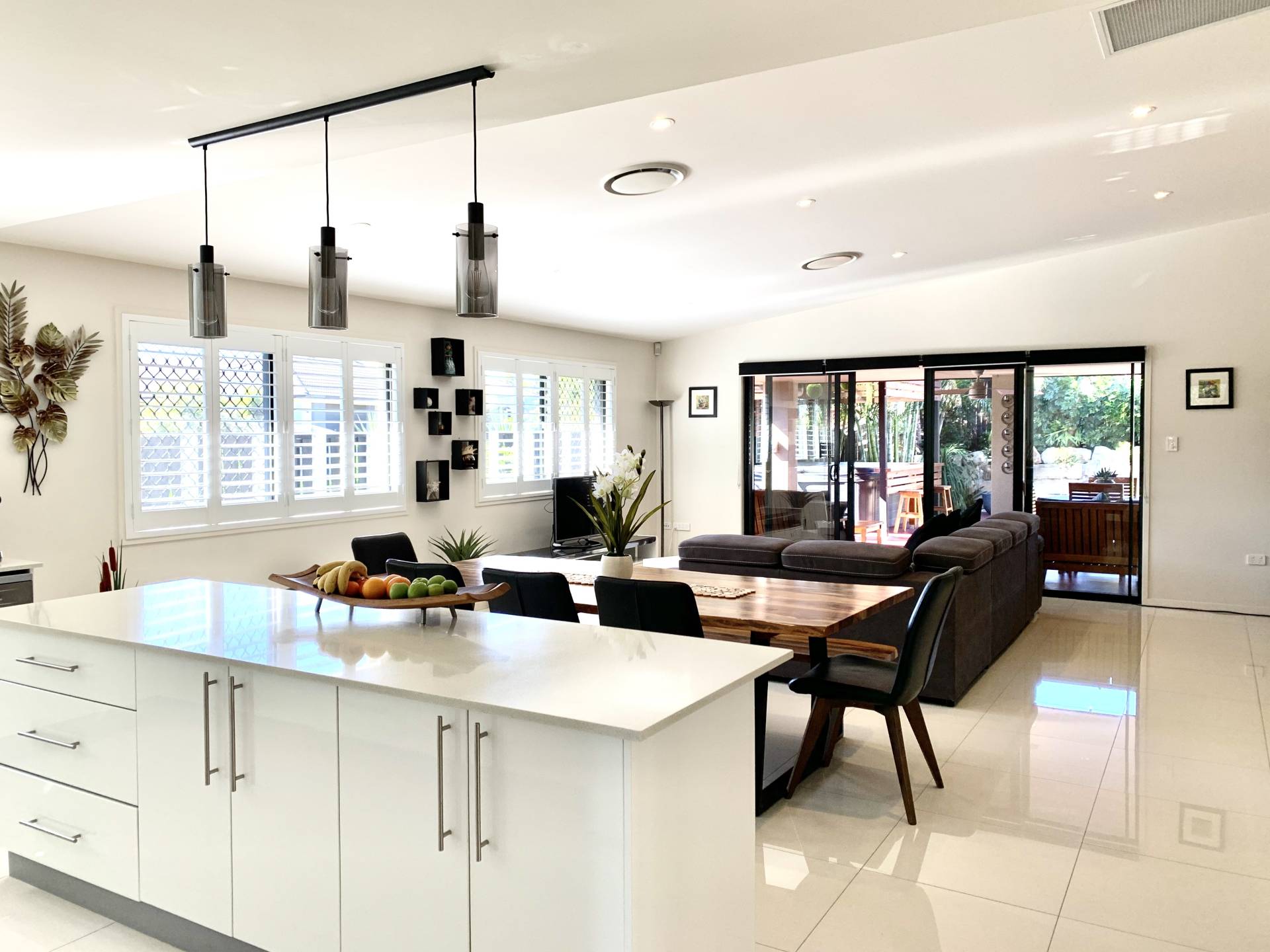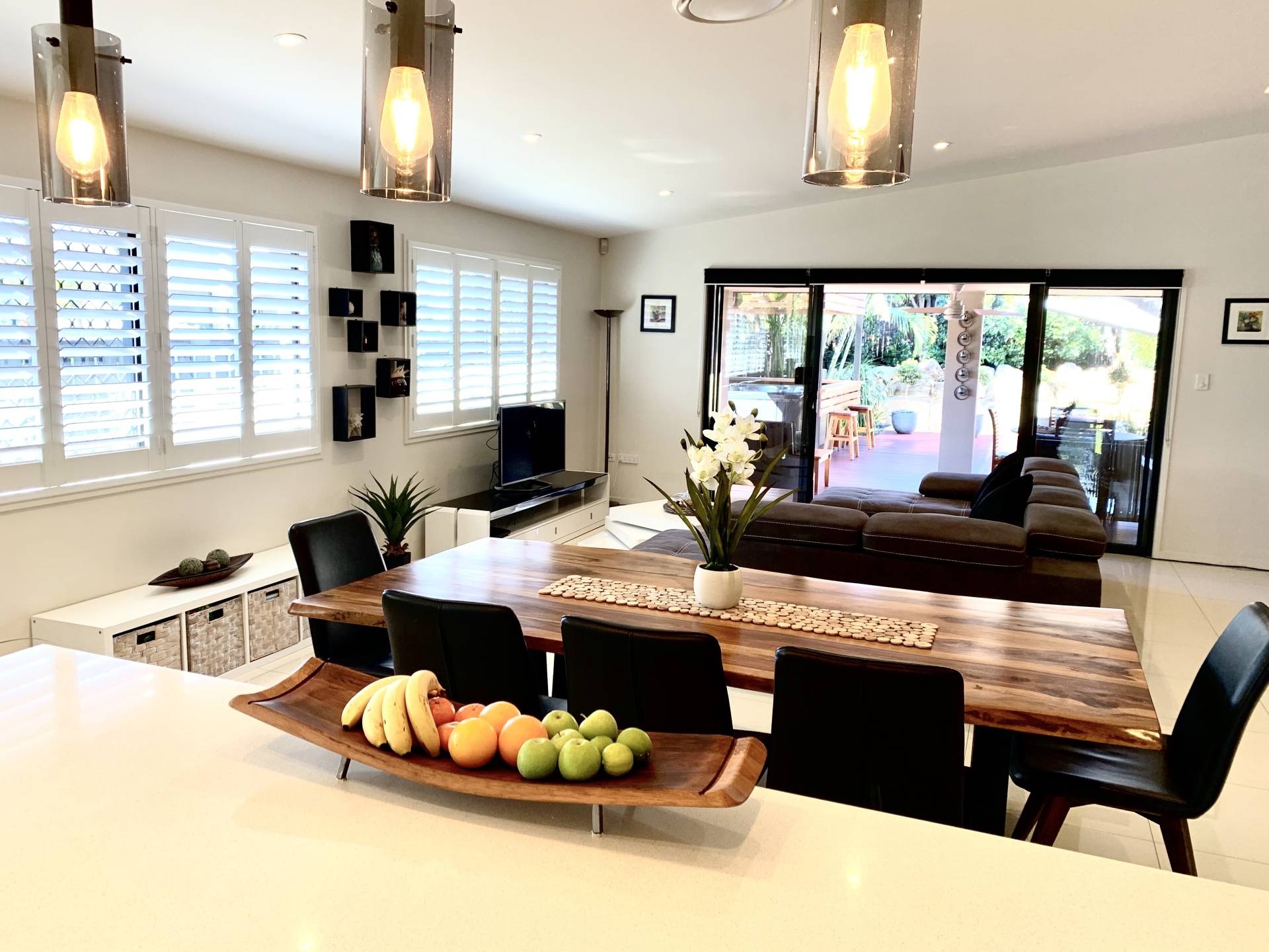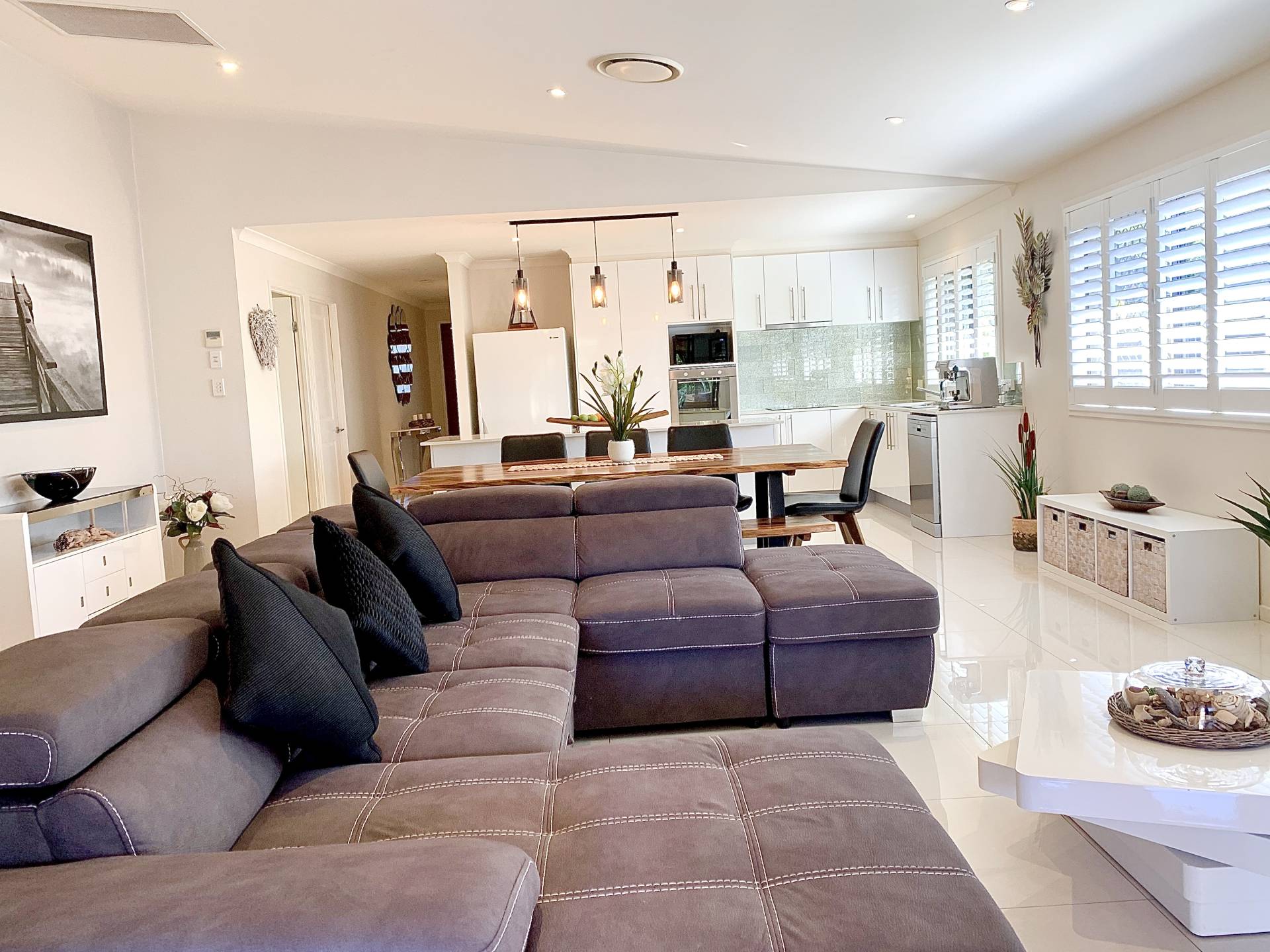 From the moment you walk in it is obvious that this home is at the top end of the scale with luxury plantation shutters , polished porcelain tiles, stone benchtops throughout, huge shower recesses, a large alfresco with timber deck and luxury spa and a low maintenance yard.  The central kitchen showcases plenty of bench space with gloss cupboards and European appliances and overlooks the large open plan family room so guests and hosts are all included when entertaining. It is bright and airy and has a wonderful calm feeling to it.