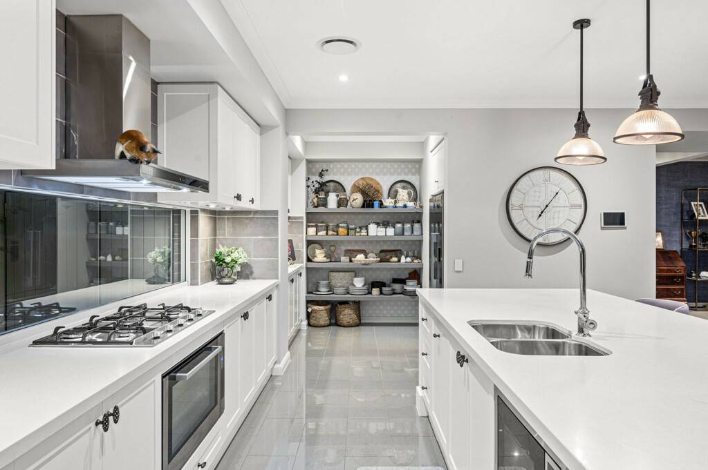 Hostess kitchen with huge island bench and walk in pantry.